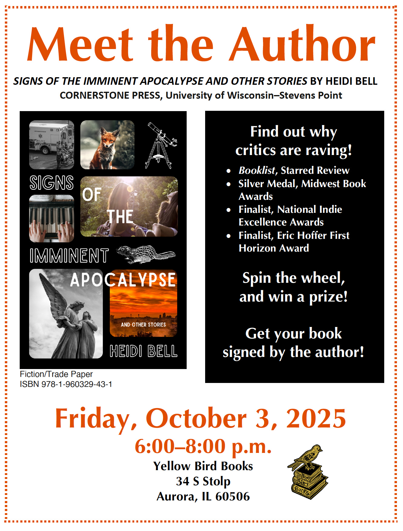 Author Heidi Bell will be joining us on Oct 3rd for First Friday. You can learn more about Heidi Bell on her website here and order Signs of the Imminent Apocalypse and Other Stories to ship to you here.